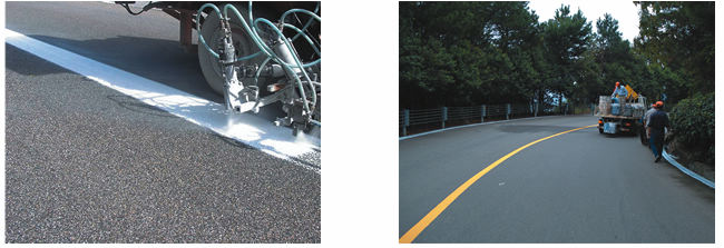 施工方式:A、B两组份充分混合,通过双组份喷涂型道路标线划线机涂覆于路面,并且撒布高折射率玻璃珠,经交联固化反应在道路路面形成高亮、耐久性好的道路标线涂层